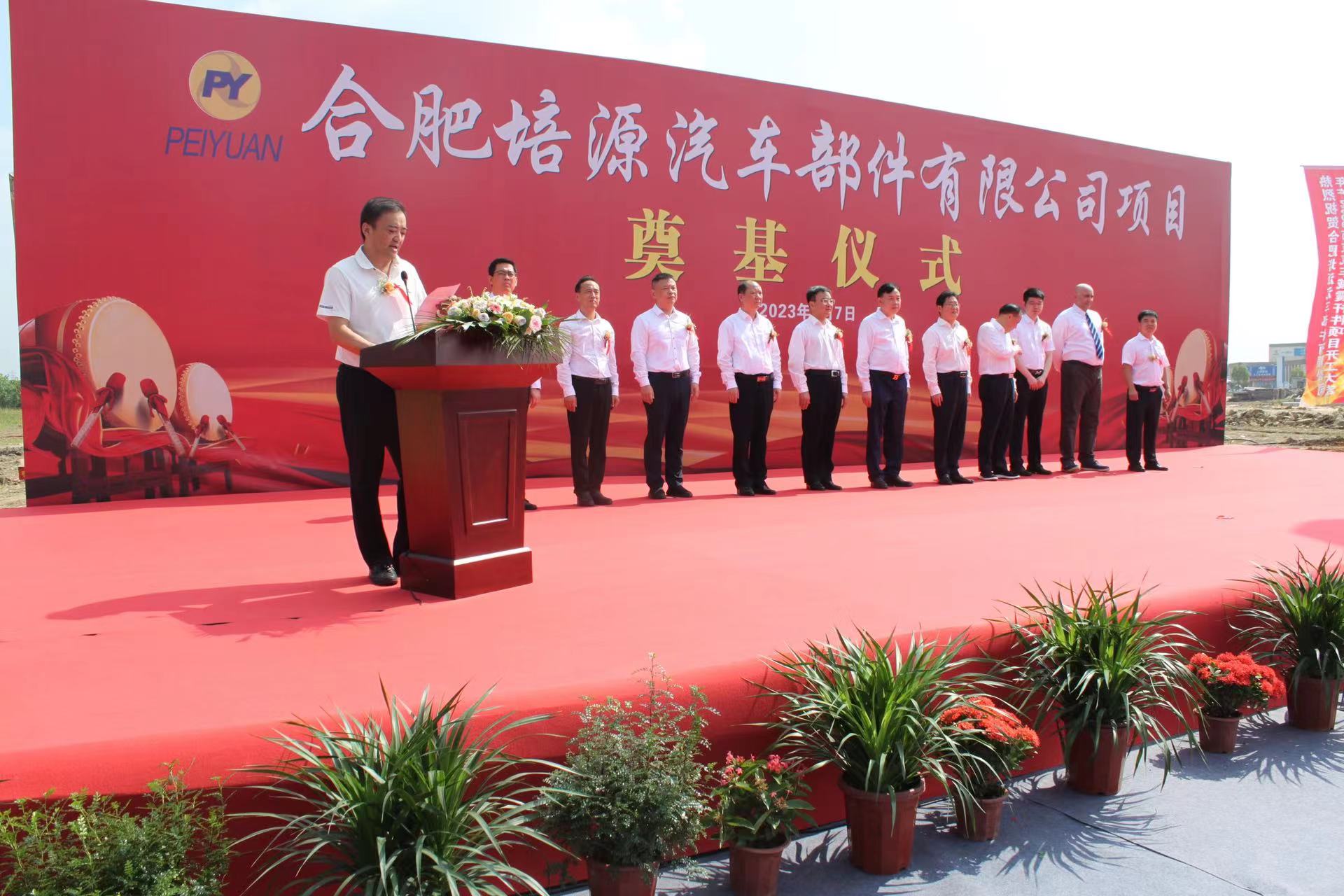 2023年9月7日上午,由sunbet申搏所属合肥瑶海钢构建设工程有限责任公司承建的合肥培源汽车部件有限公司年产2500万支汽车减震杆件项目奠基仪式在巢湖市居巢经开区隆重举行,巢湖市主要领导,建设方代表、施工方代表莅临参加,工地现场彩旗飘飘、花团锦簇。