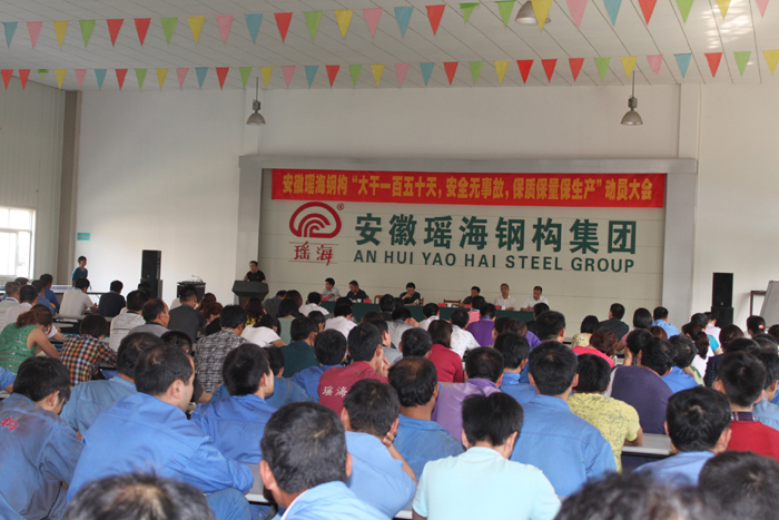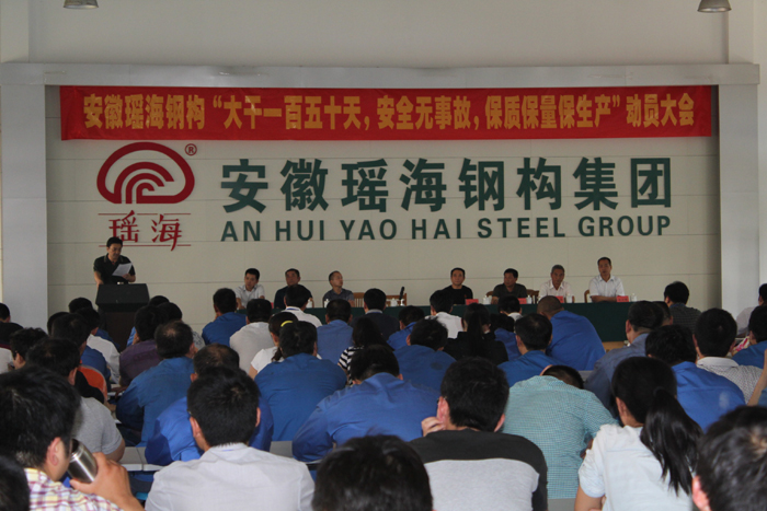 这次动员大会是一次统一思想、鼓舞士气、昂扬向上的大会,也是一次凝心聚力的大会、更是我们再接再励,开展劳动竞赛活动,掀起生产新高潮、走向瑶海新胜利的大会。战鼓已经擂明,号角已经吹响,相信我们瑶海这支纪律严明的铁军,必然会树立“协同作战、敢打必胜”的信念,发扬 “不畏艰难、连续作战”的精神。我们坚信:以这次大会为契机,深挖内部潜力,科学管理周密安排,坚持“以质量保安全,以安全促进度,”的管理理念,这次“大干150天、安全无事故、保质保量保生产”劳动竞赛活动一定能取得圆满成功,瑶海钢构的宏伟蓝图在全体瑶海人的共同努力下也一定能够描绘的更美好。