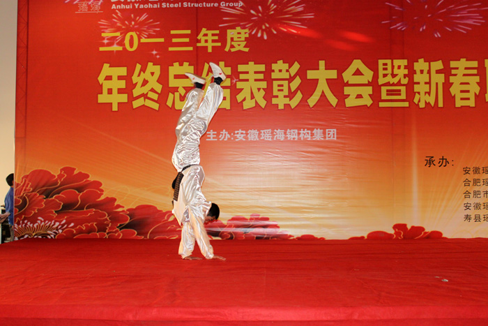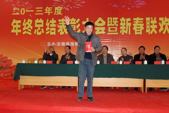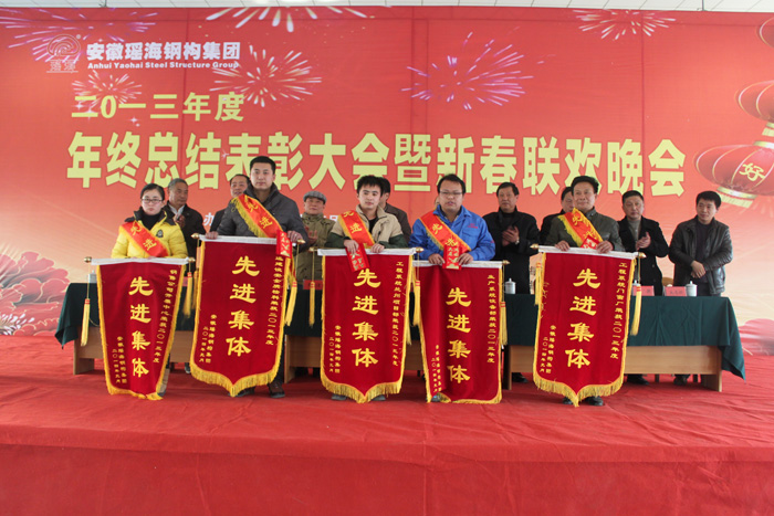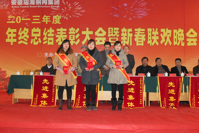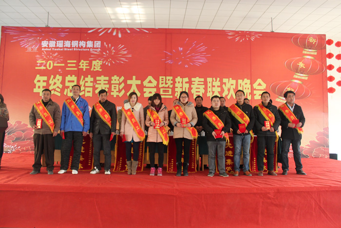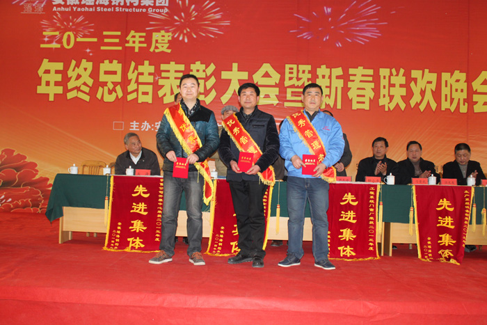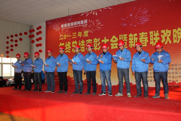 表彰会上,党组书记廖和清宣读了表彰决定,董事长凌红兵作公司总结:凌总首先代表公司向大家致以节日的问候!同时,向兢兢业业辛勤工作在各条战线上的每一位瑶海钢构的同仁表示衷心的感谢!2013年,集团公司各部门围绕年度总体经营目标,克服种种困难,公司各部门上下一心共同努力,全年共承接工程22个,项目大小从上亿元至上千万元不等。虽然业绩与过去相比有所下滑,但是兰州火车站的成功签订,寿县钢结构重钢基地全新开建让瑶海钢构向重钢转型描下重重的一笔。会上凌总指出,在成绩面前,我们也应该清晰地看到不足:一是安全事故时有不断,仅生产系统全年安全事故就发生多起;二是管理不力,大锅饭现象比较严重,绩效体制没有能够完全建立起来。另外公司整体执行力不够、管理仍待规范等都需要我们在2014年要重视和改进。