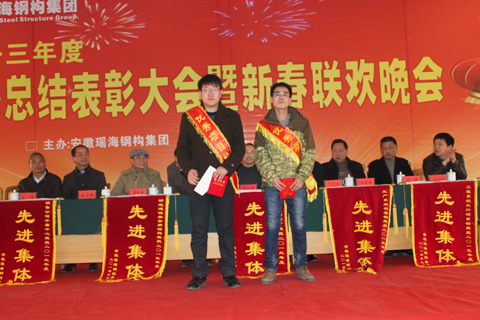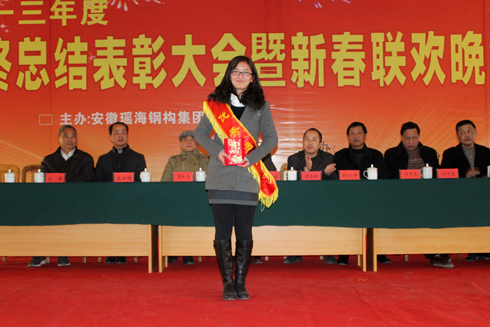 表彰会上凌总还通过具体的实例说明2013年所取得各方面的成绩并表扬了为成绩做出努力的员工。2013年,工程系统副总经理王一麟可谓是独树一帜,每天往返于业主单位和公司之间,做好与客户的沟通工作,并及时地处理售后事宜,以便较快地回笼资金,与此同时,于公司内部大事小事及难处理的事,他都给予及时地处理和妥善地解决,为公司的正常运转立下了汗马功劳;兰州火车站在黄志经理的带领下加班加点,任劳任怨,全力以赴抢抓抢点,不仅得到了业主方的一致认可和好评,更是为公司赢得了荣誉,企管中心在2013年也发挥了应有的作用,对于问题的出现能一查到底,保障了公司管理的正常进行。宣传部在一个人的情况下,报纸、网站做的非常出色,得到了相关企业界的好评……今天,即将在大会上表彰的先进个人就是我们瑶海钢构员工的杰出代表,是我们企业的脊梁。