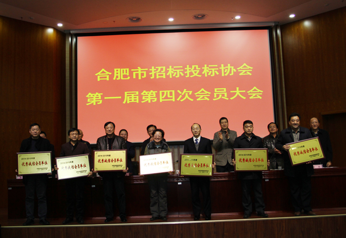 本报讯:2016年1月14日,合肥市招投标协会在要素大市场隆重召开协会第一届第四次会员大会。会议的主要内容有合肥市招标投标协会2015年工作报告;合肥市招标投标协会2015年度会费收支情况报告;增补副会长、常务理事、理事的报告; “合肥市招标投标协会2014—2015年度优秀诚信会员单位”表彰暨授牌仪式;协会2016年轮值会长交接仪式;合肥市公共资源交易监督管理局领导讲话。瑶海钢构董事长凌红兵应邀参加会议。
