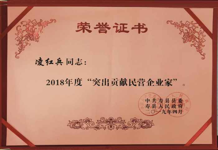 本报讯:2019年4月,瑶海钢构建设集团董事长凌红兵荣获寿县“突出贡献民营企业家”。
