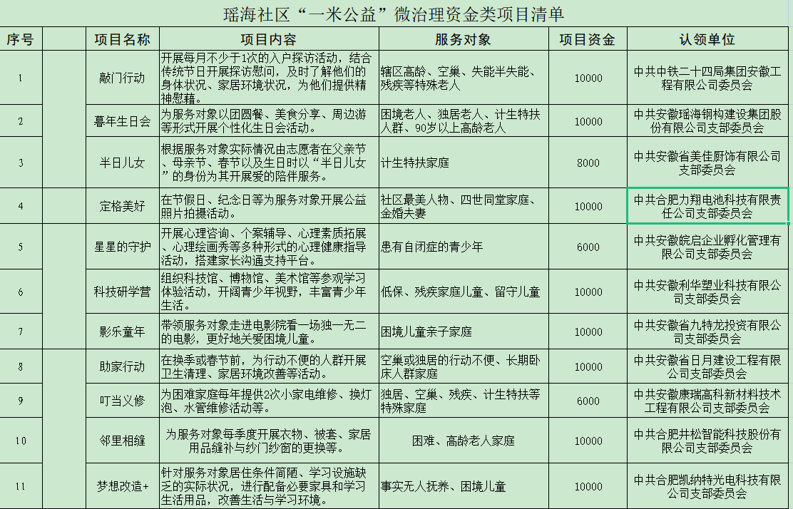近日,新站高新区瑶海社区党委在sunbet申搏合肥技师学院大礼堂召开“一居一品”党建品牌推介暨“近邻”微治理项目认领仪式,瑶海钢构参与“近邻”微治理项目认领,捐赠10000元爱心资金,定向配套于微治理项目:暮年生日会。为困境老人、独居老人、计生特扶人群、90以上高龄老人以团圆餐、美食分享、周边游等形式开展个性化生日会活动。