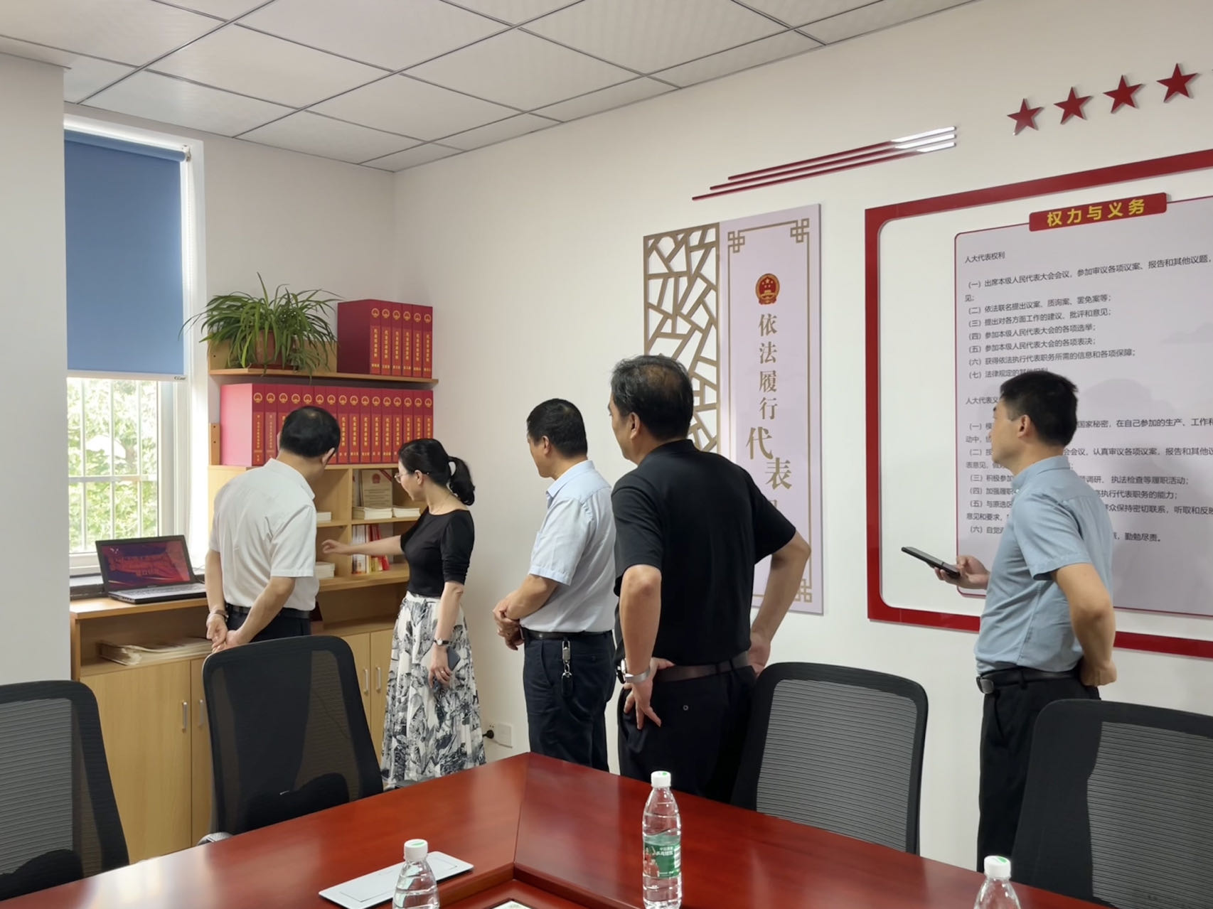 调研组一行实地察看瑶海团第一代表小组活动室建设、管理、运行情况。集团董事长凌红兵为大家介绍企业的党建、文化建设。第一代表小组联络员季勤为大家讲解瑶海团第一代表小组活动室的基本情况。为更好的支持和保障人大代表在闭会期间执行代表职务,发挥代表作用,瑶海团第一代表小组活动室按照标准做到:“六有”“五上墙”、“五登记”建设。“六有”即“有场地、有设施、有制度、有组织、有活动、有记录”。“五上墙”、“五登记”,即:区域划分图上墙、代表简历上墙、代表权力义务上墙、活动计划上墙、工作流程上墙;统一制发代表活动签到簿、代表活动记录簿、代表建议批评意见登记簿、代表联系群众登记簿、代表接待群众登记簿,为瑶海团第一代表小组线下履职提供一个良好环境。