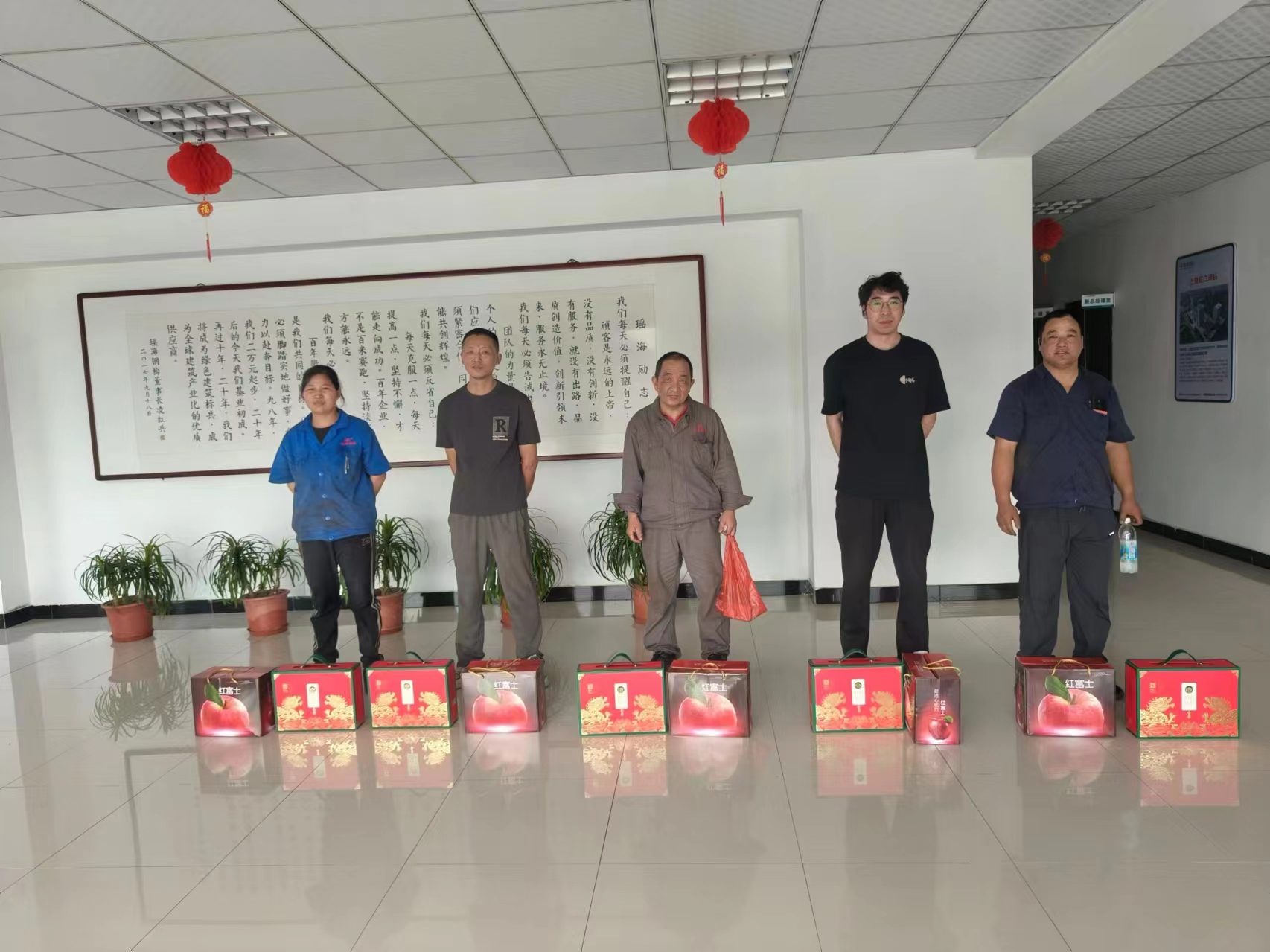 瑶海钢构集团工会主席史中吏代表集团公司将苹果、粽子等慰问品送到了职工手中,对长期以来坚守岗位、辛勤付出的职工表示衷心感谢。“礼轻情意重,关怀暖人心”,当一份份饱含公司关爱和祝福的慰问品,送到职工的手中时,大家喜悦之情溢于言表。