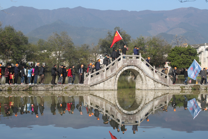 第三站黟县宏村,宏村始建于北宋,距今已近千年历史,原为汪姓聚居之地。古宏村人独出机抒开 "仿生学"之先河,规划并建造了堪称"中华一绝"的牛形村落和人工水系,统看全村,就象一只昂首奋蹄的大水牛,成为当今"建筑史上一大奇观"。全村现保存完好的明清古民居有140余幢。村内鳞次栉比的层楼叠院与旖旎的湖光山色交相辉映,动静相宜,空灵蕴藉,处处是景,步步入画。从村外自然环境到村内的水系、街道、建筑,甚至室内布置都完整地保存着古村落的原始状态,没有丝毫现代文明的迹象。造型独特并拥有绝妙田园风光的宏村被誉为"中国画里乡村"。