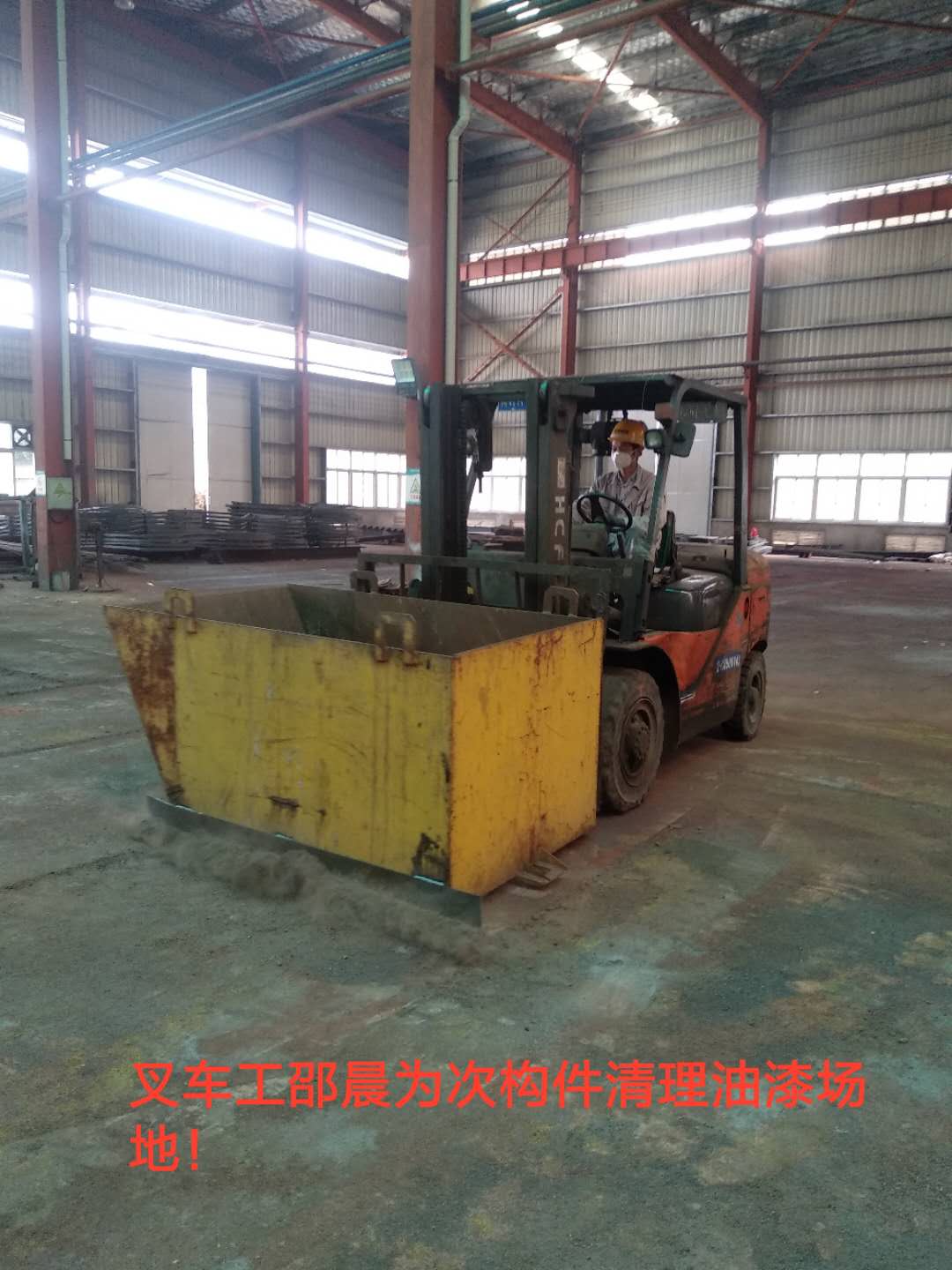 油漆车间因为经常喷漆,导致地面的油漆铺满地面,一是影响环境,二是危险不安全,为此,在车间主任的安排下,由叉车工邵晨驾驶叉车对油漆地面进行铲除!