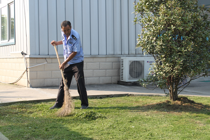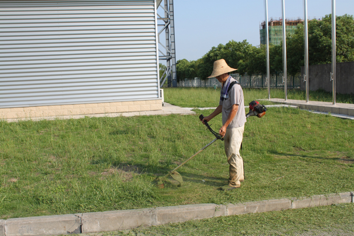 本报讯:2012年9月7日,室外依然高温不下,烈日当头,公司保洁员王存扣、“治理环境卫生”的凌德龙、保卫员仉长立、薛金龙在工会王主席的带领下,不辞辛苦为公司美化环境服务,只见王师傅头戴草帽,臂披护膝,手拿剪刀在修理参差不齐的花坛花草,那边的凌师傅全身武装,用割草机清除地面的杂草,随着杂草被铲除,他满头大汗,全身湿尽,最后保卫人员将铲除的杂草清扫成堆并运送到公司外,数小时下来,公司的环境顿时美观了很多,这归功于他们的辛苦劳作。