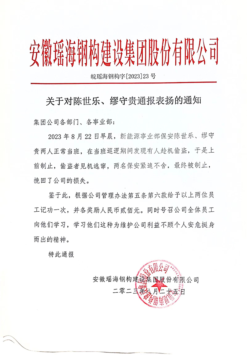2023年8月22日早晨,新能源事业部保安陈世乐、缪守贵两人正常当班,在当班巡逻期间发现有人趁机偷盗,于是上前制止,偷盗者见机逃窜,两名保安紧追不舍,最终被制止,挽回了公司的损失。