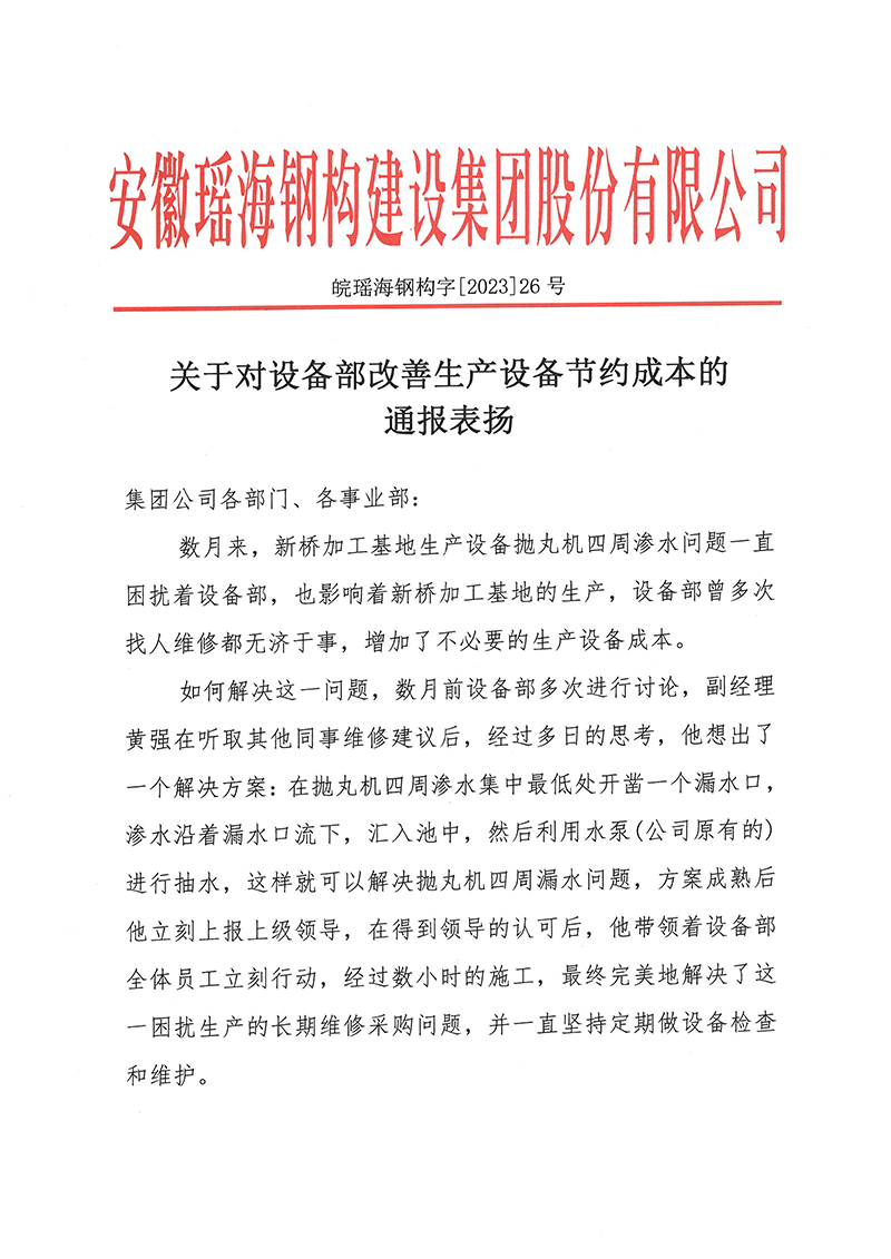 鉴于此,根据公司管理办法第六条第三款规定,给予设备部记大功一次,并给予黄强奖励人民币伍佰元、张传春、张磊、罗治福、权春良各奖励三百元,同时号召公司全体员工向他们学习,学习他们这种为公司实现成本最小化利益最大化的思想和专研的精神。
